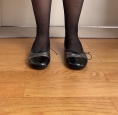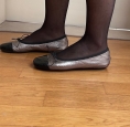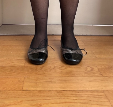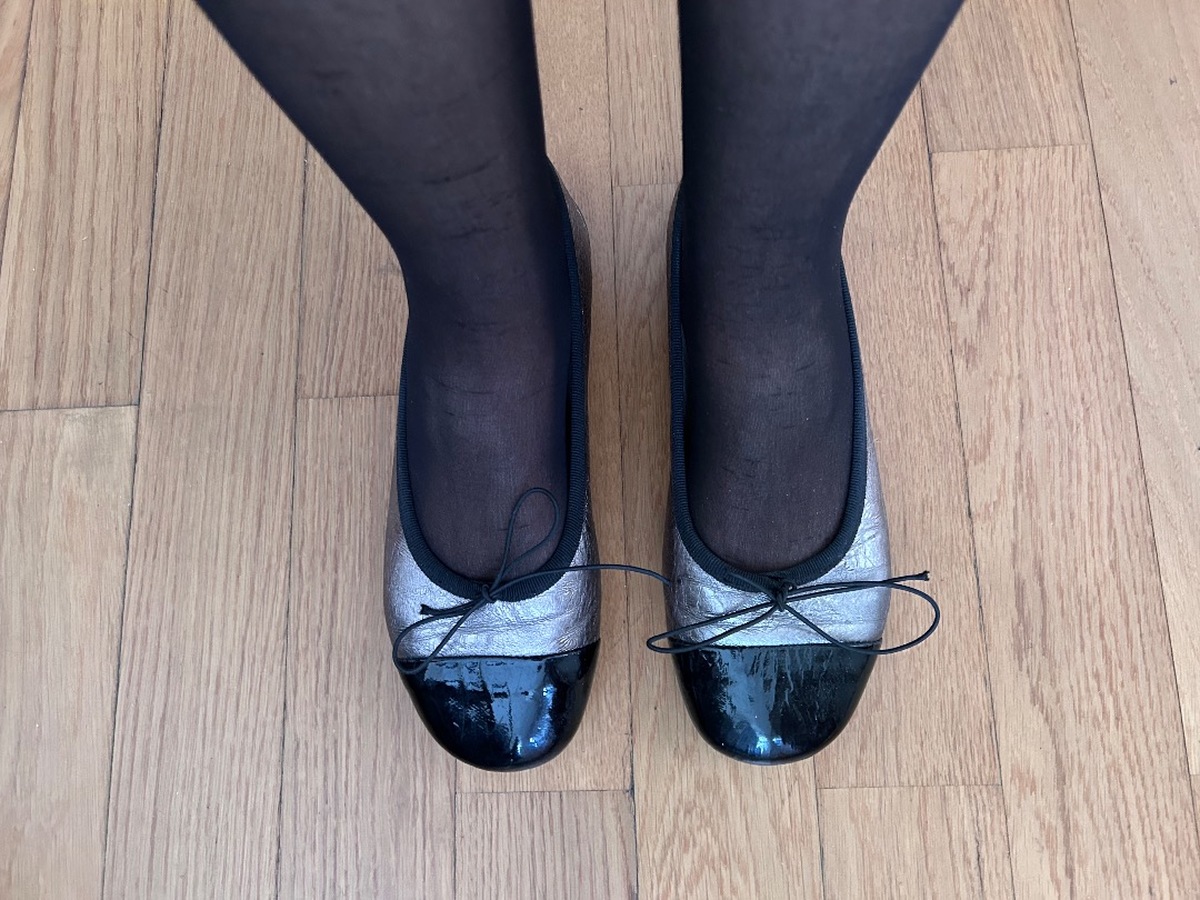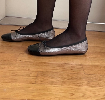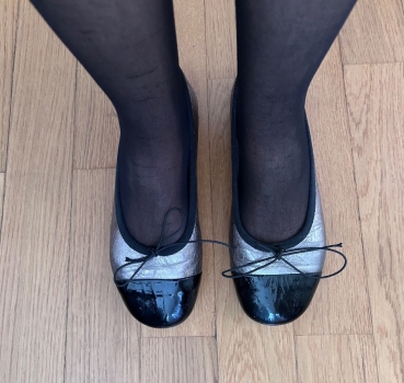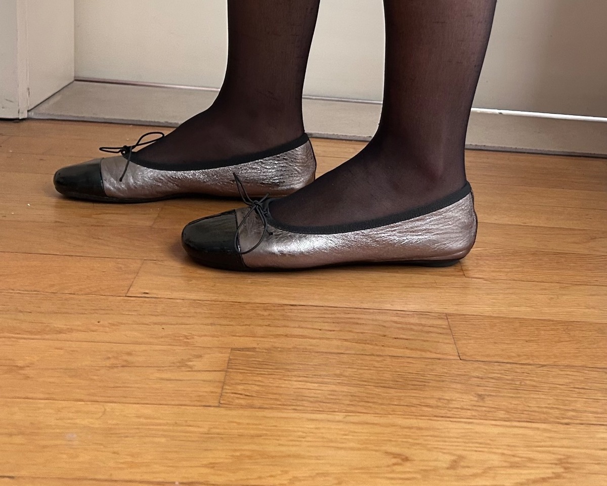 Two-colour leather ballet flats with black patent toe caps black trim and bow details, and bronze leather. Lightweight slip-on shoes with rounded shape. Used condition with some wear signs.
