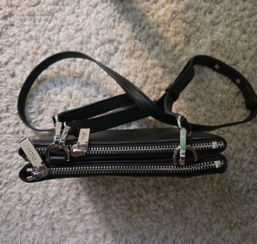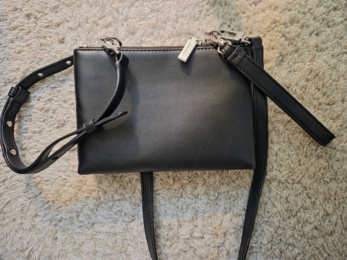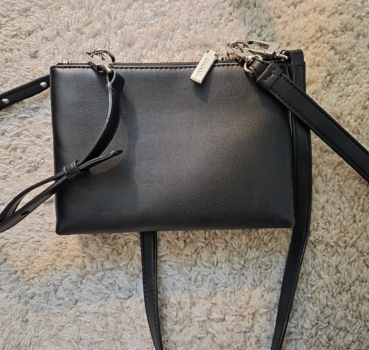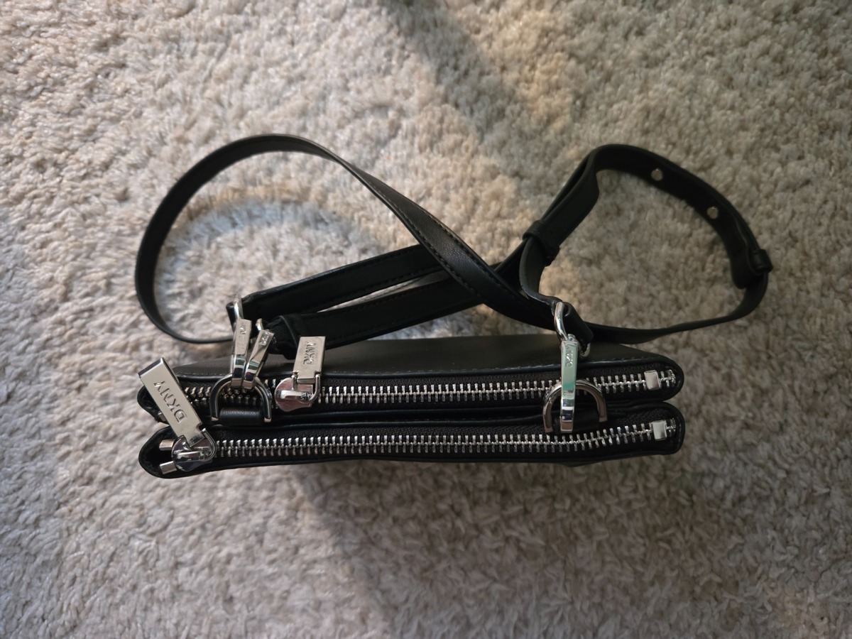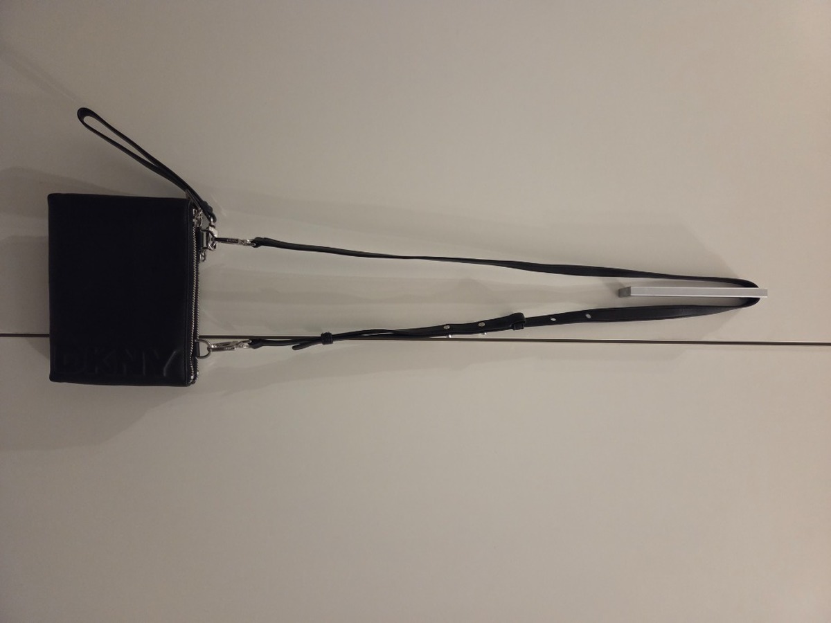 Sac DKNY noir en bandoulière amovible et réglable. Peut être aussi utilisé en pochette. Deux compartiments zippés. A l'intérieur du premier compartiment une poche intérieure. Dans le second, une poche zippée. Possibilité d'avoir un sac à poussière d'une marque pour le protéger. En excellent état, porté une seule fois. 19cm de largeur, 14cm de hauteur et 4cm de profondeur.