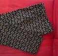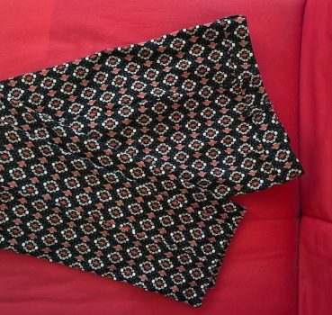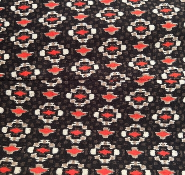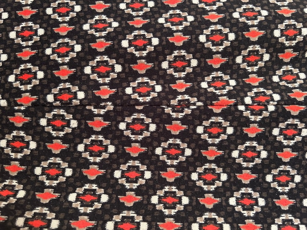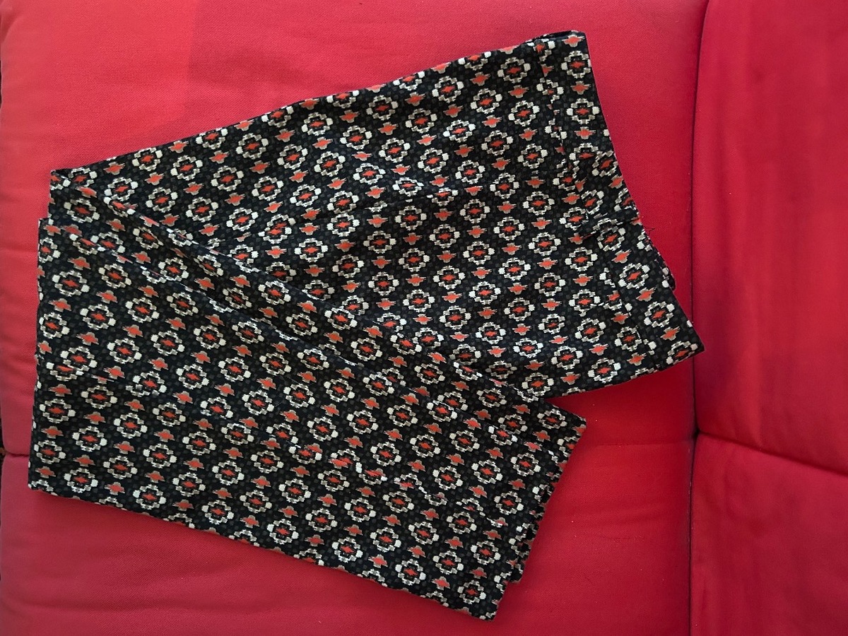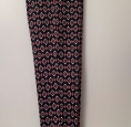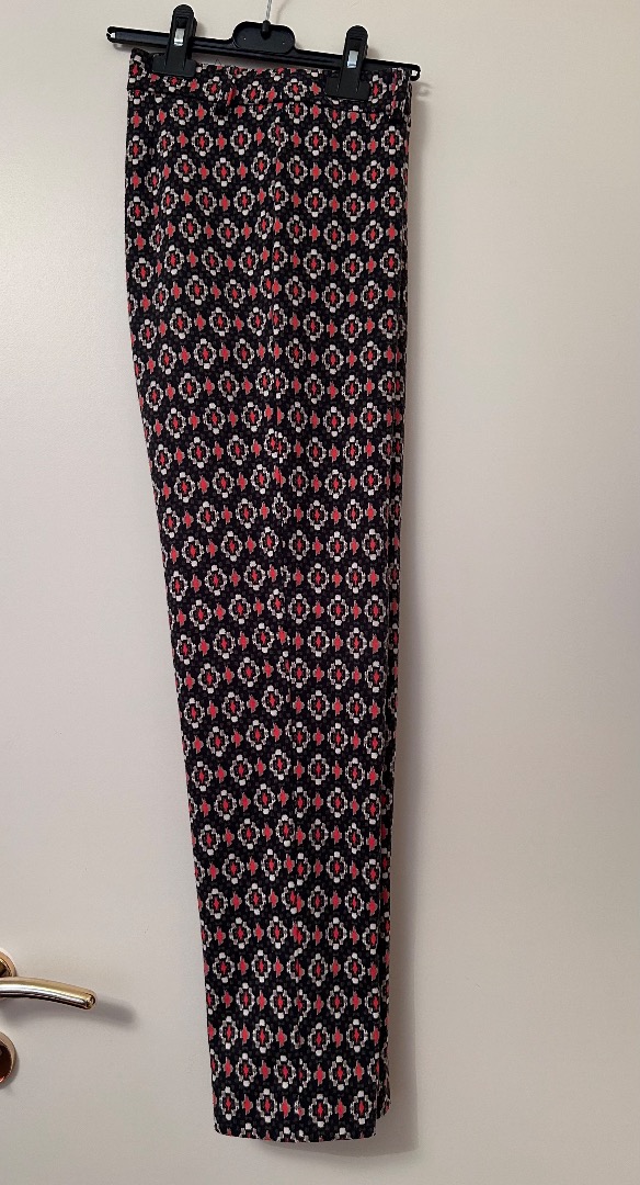 Slim-fit trousers with an all-over black, red, white geometric pattern. Full-length design with a fitted leg and smooth fabric. Italian brand OLTRE. Original size is IT 44.
