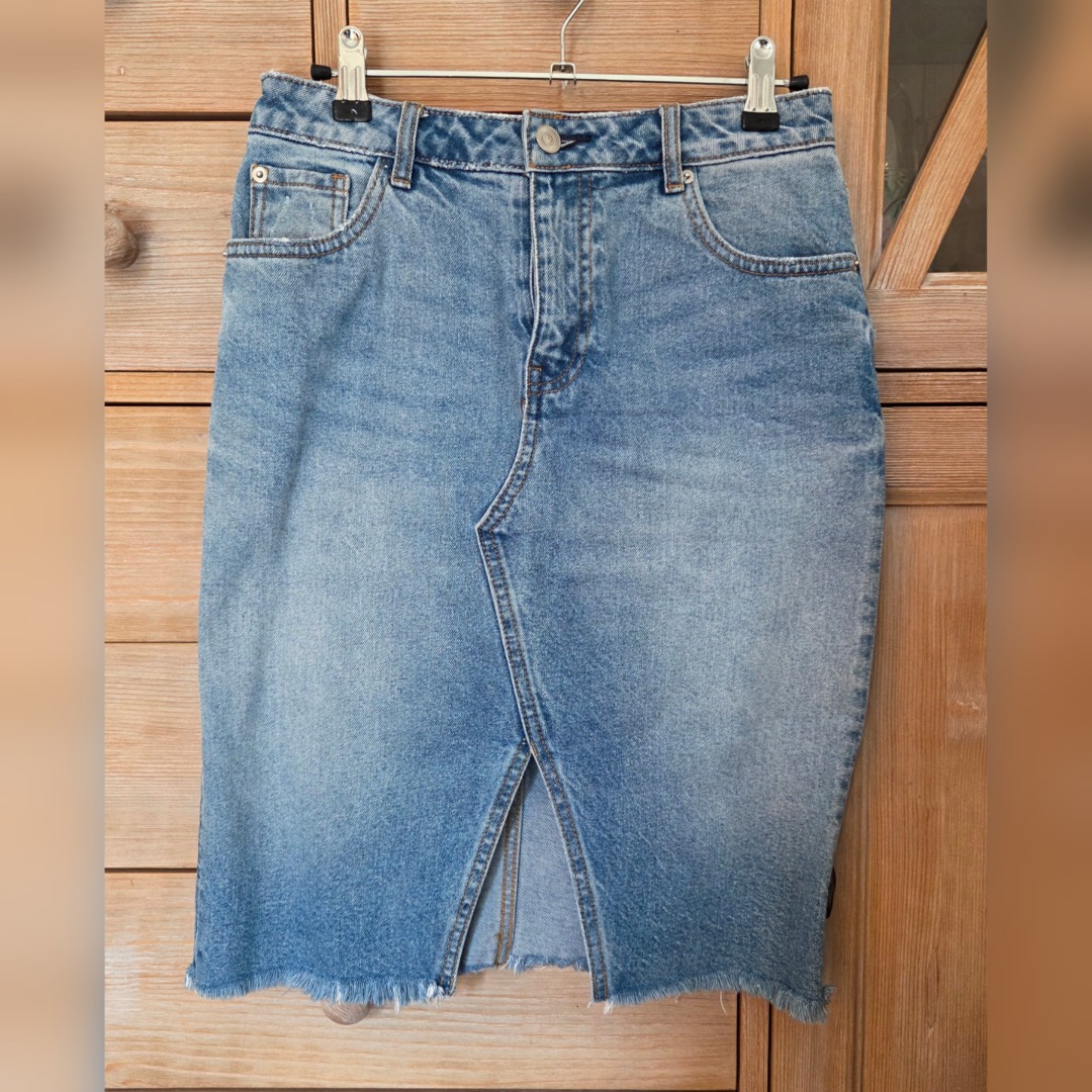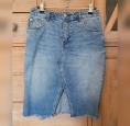 Robe en jean taille haute, coupe crayon, fendue devant, bas de la jupe en bord franc, sans couture (effet effilé). très peu portée. Longueur genous.