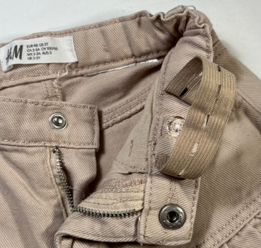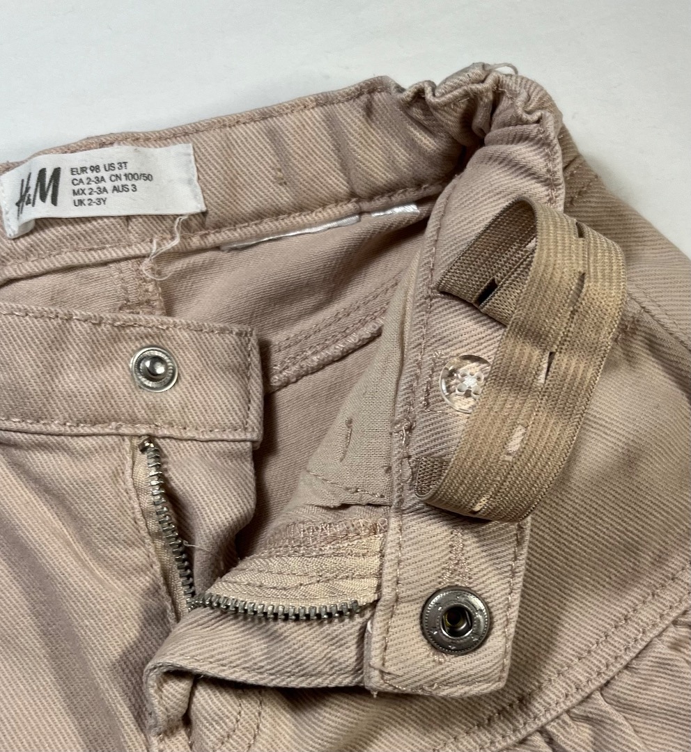 Particularités: Ceinture reglable avec bouton et elastique (8 positions), deux poches avant, 5 passant ceinture. Petite fermeture éclair et bouton à l'avant.