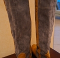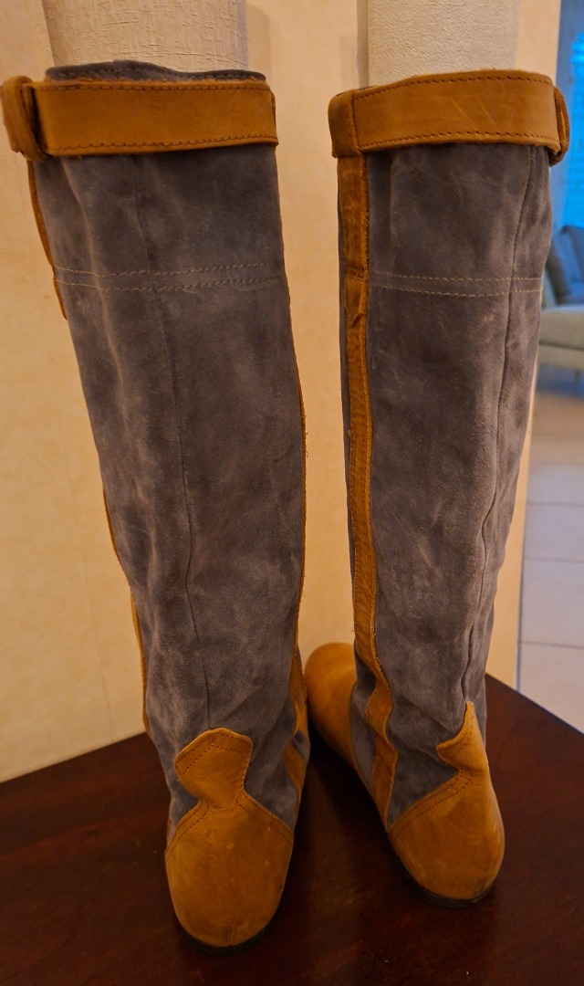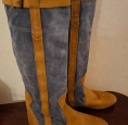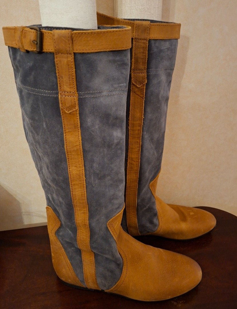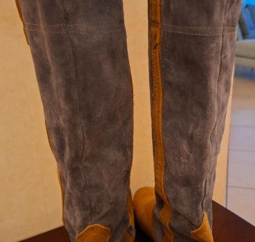 Bottes longues en daim bleu jeans et cuir beige.