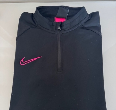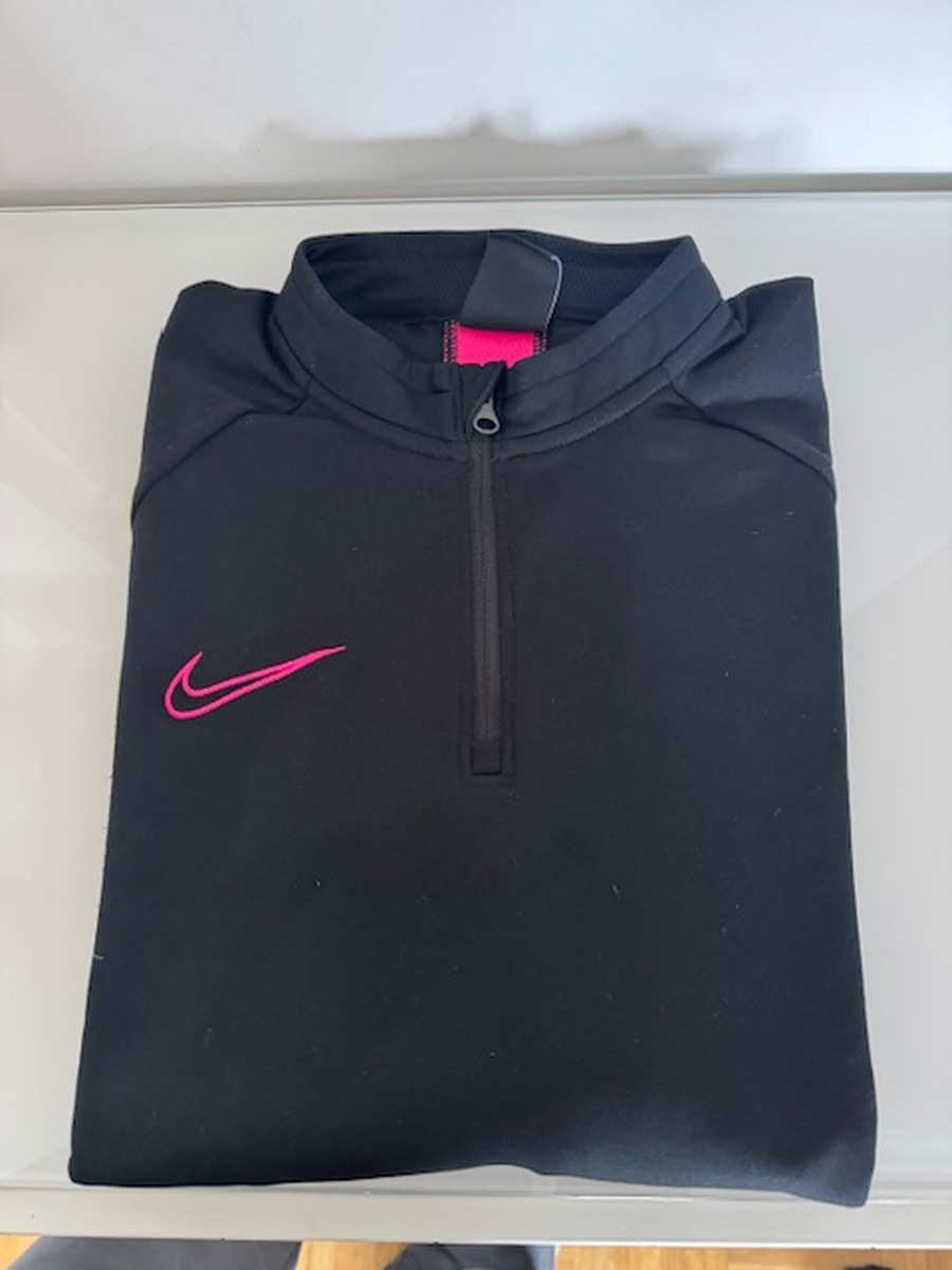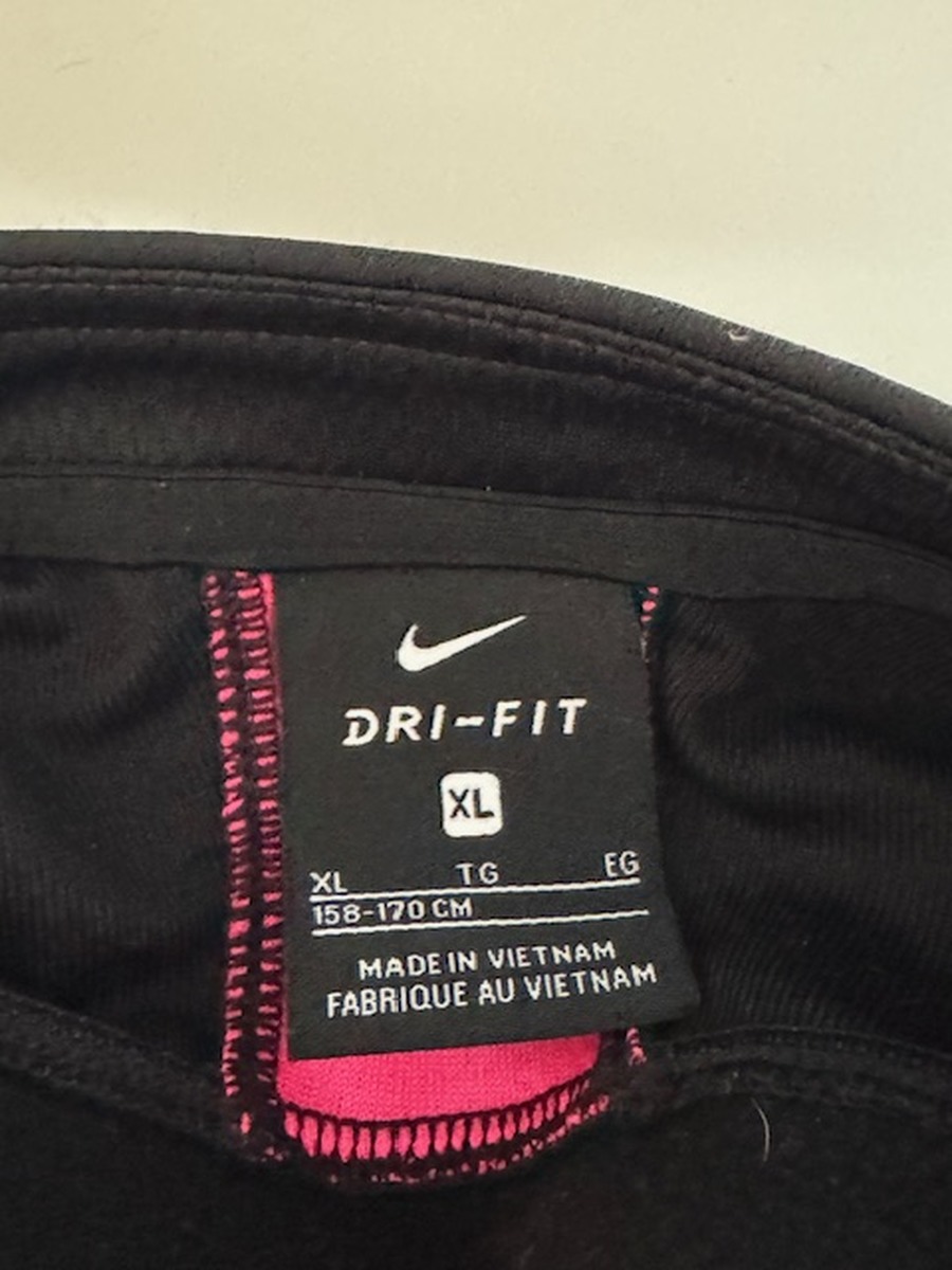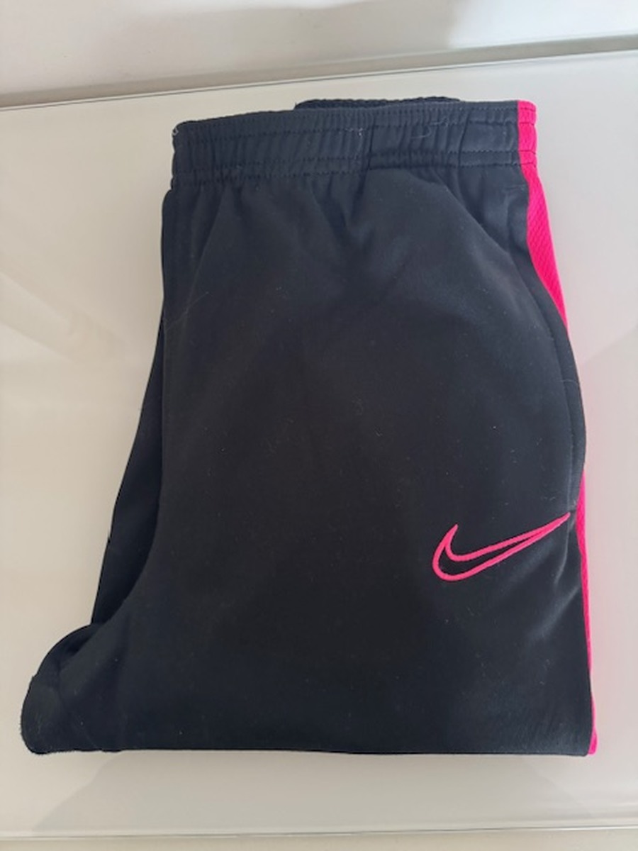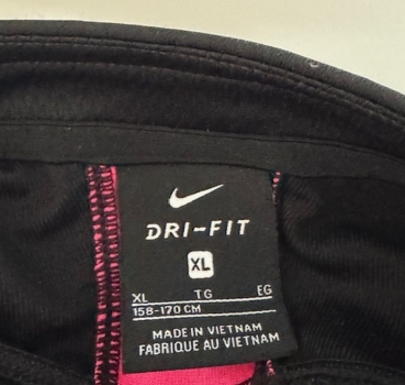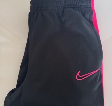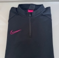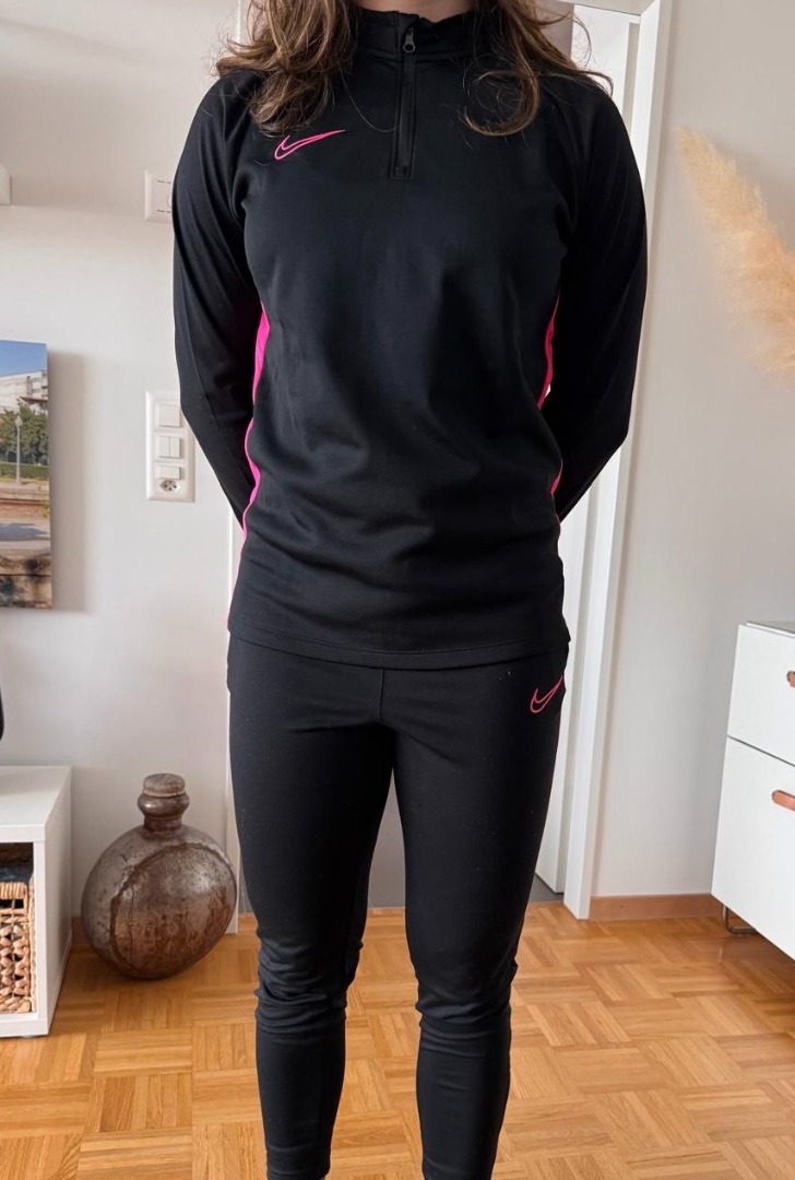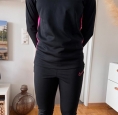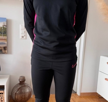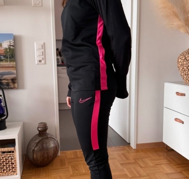 Ensemble de survêtement Nike composé d'un haut zippé et d'un pantalon. Couleur noir avec des détails roses.