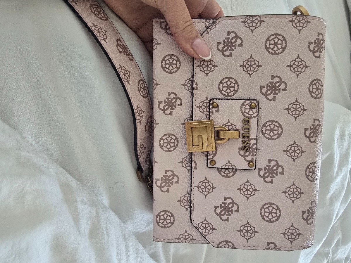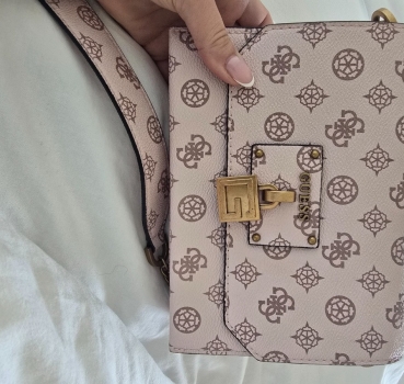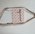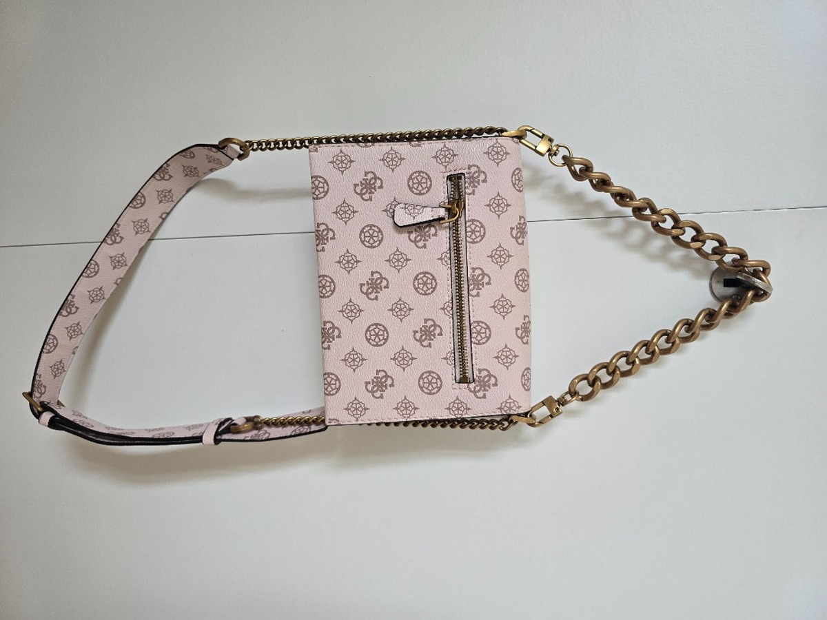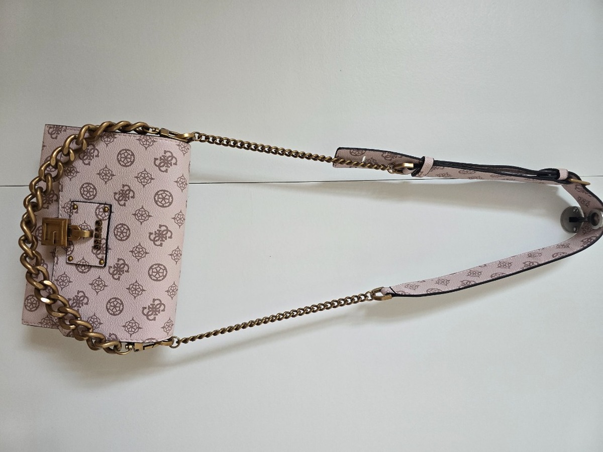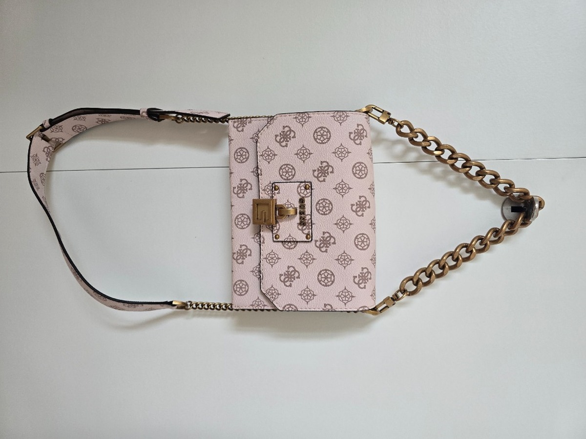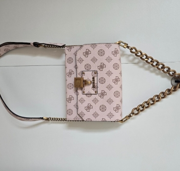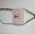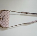 Mini sac Guess à rabat rose pâle monogramme beige, chaîne or bronze,porté épaule ou main, chaîne amovible et bandoulière amovible