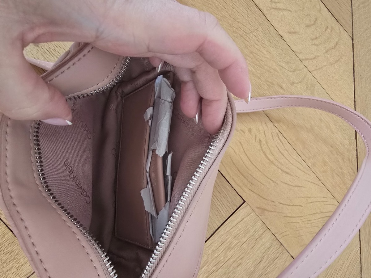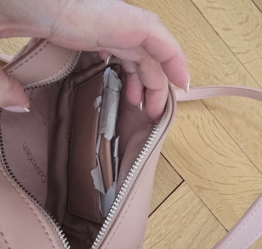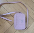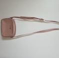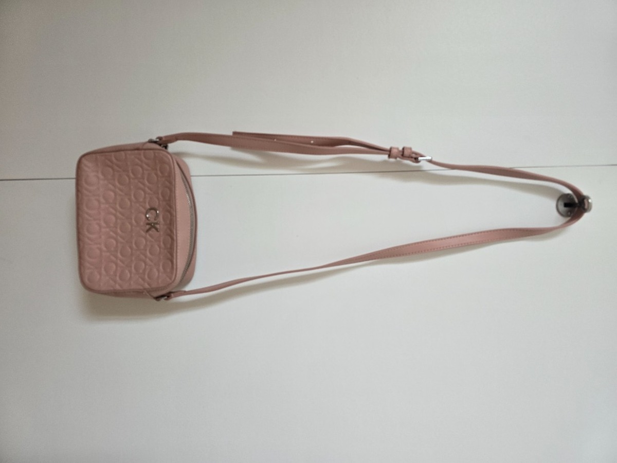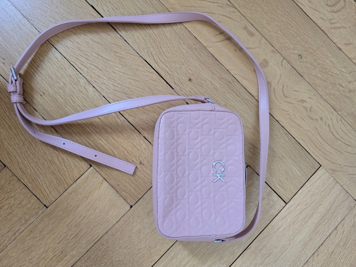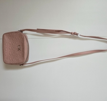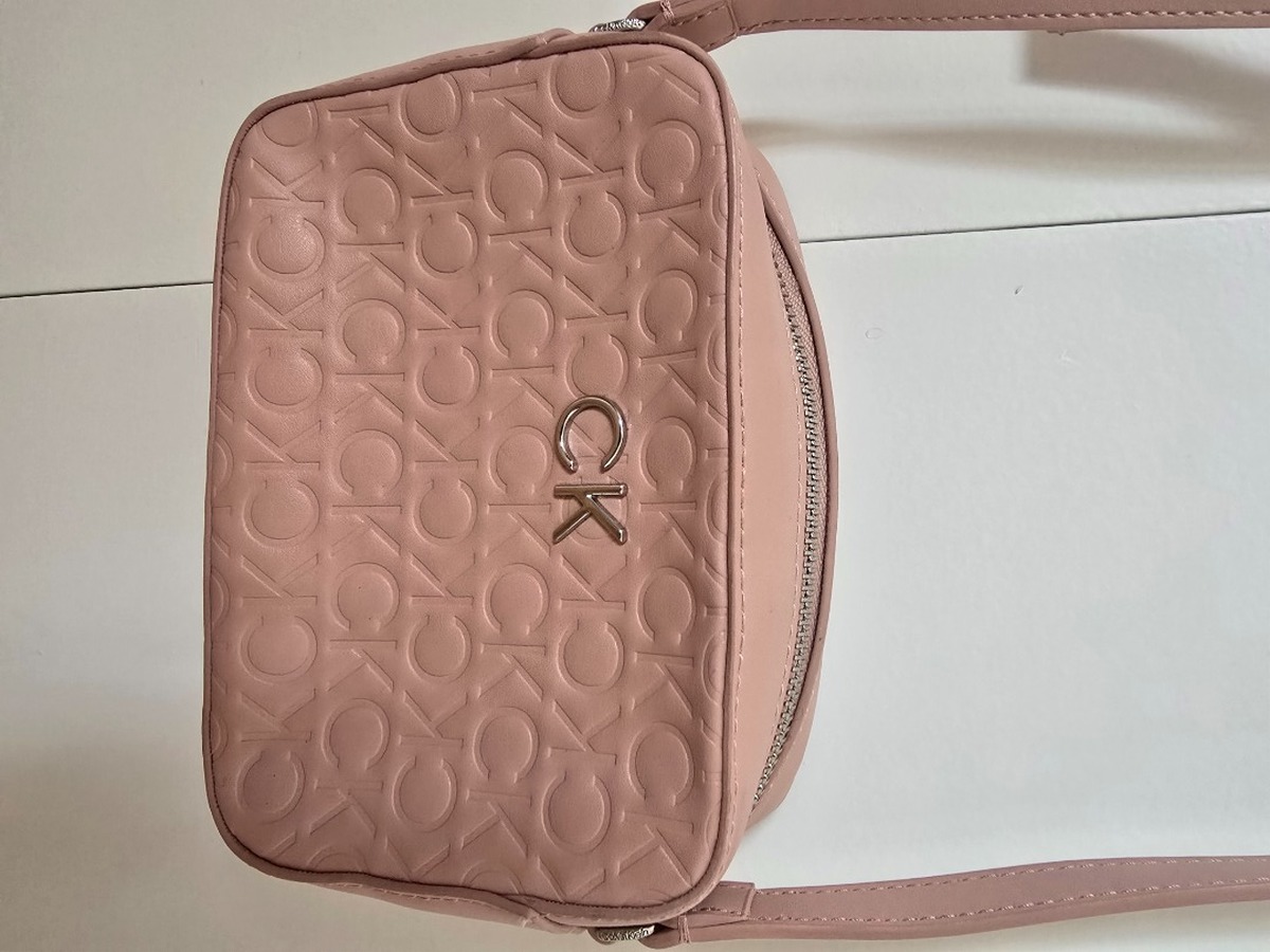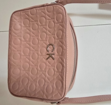 Mini bag cross body CK jeans rose pâle vieux rose monogramme gauffré ton sur ton, porté épaule bandoulière ajustable, fermeture éclair argent. Très léger et pratique.