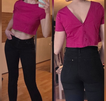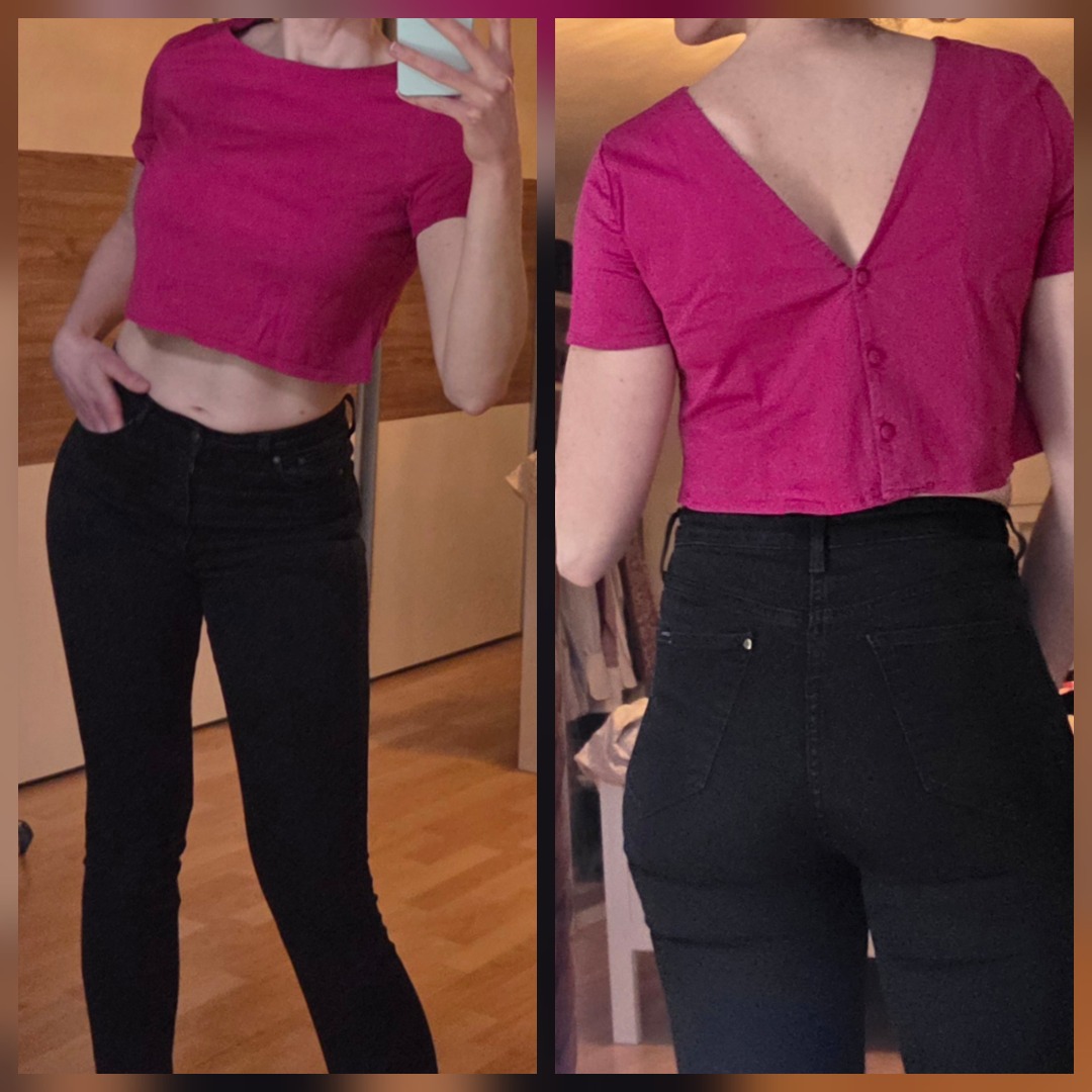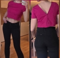 Etam crop top fuchsia, effet "blouse à l'envers" avec boutons et col V au dos.