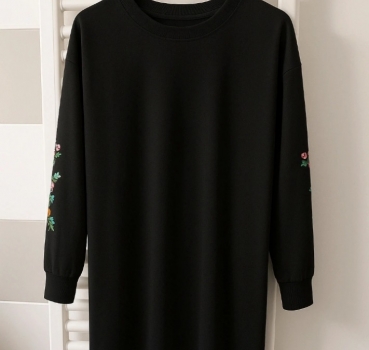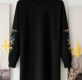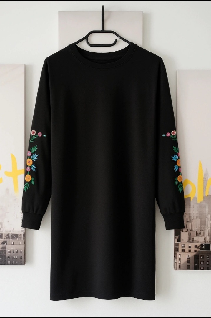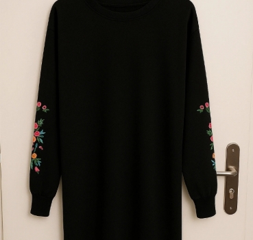 Cette robe noire longue aux manches brodées de fleurs multicolores est bien plus qu’un vêtement. C’est une invitation à l’évasion.