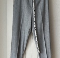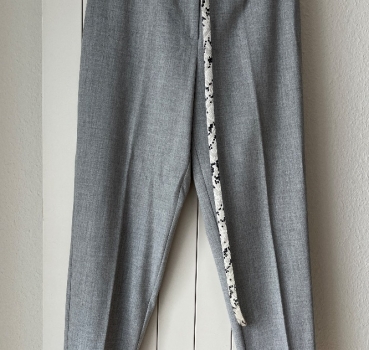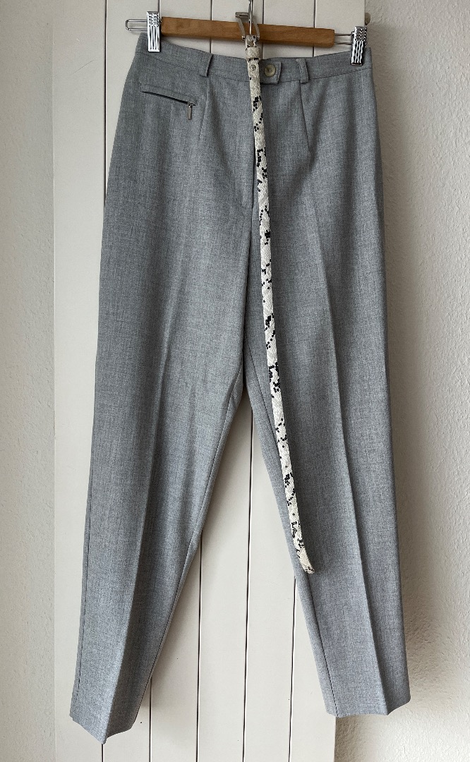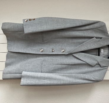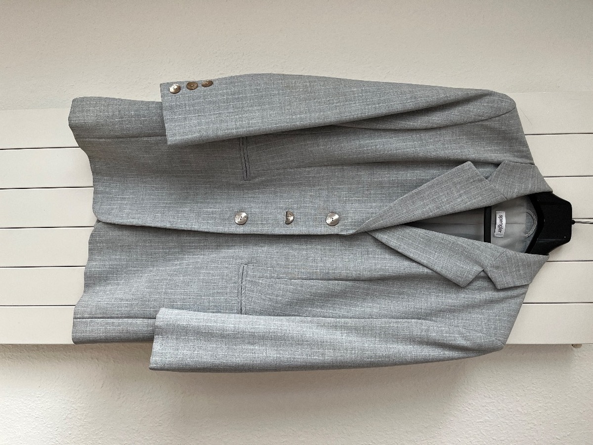 Tailleur pantalon gris clair rayé, blazer longueur 74 cm, pantalon taille 18 mélange, très peu porté.