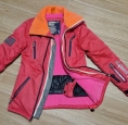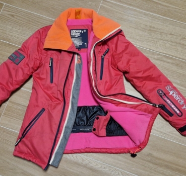 Très chaude, doublée, deux fermetures zip, 5 poches, double col dont un doublé et fluorescent,